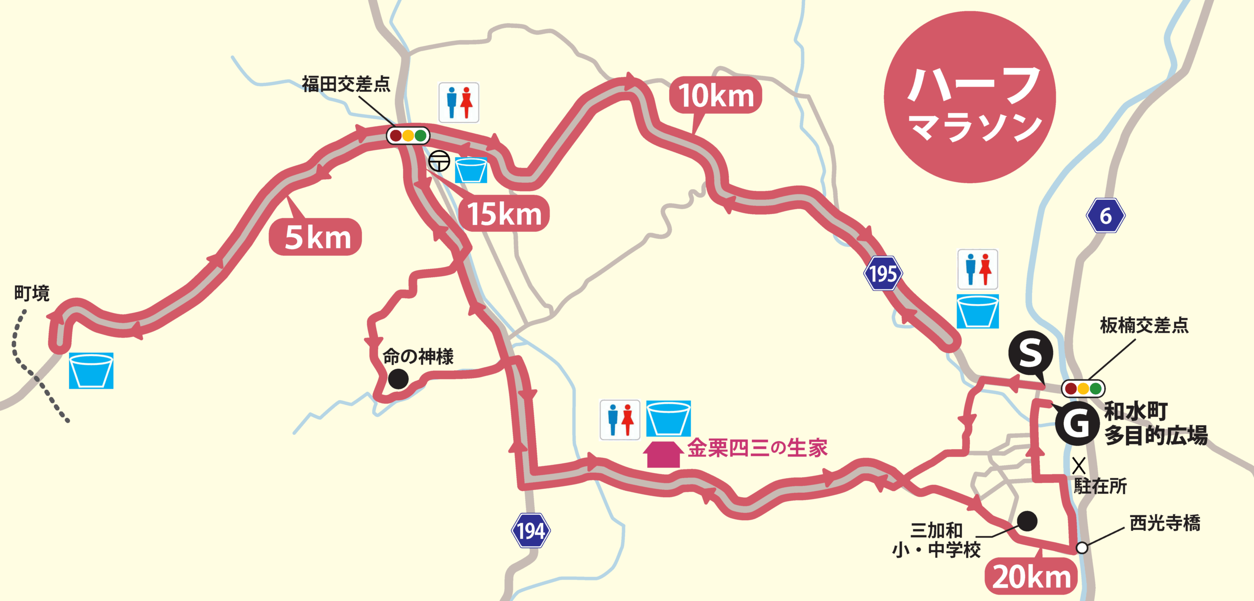 ランナーの皆様へ、当日はコース上に次のとおり給水所とトイレを設置します。